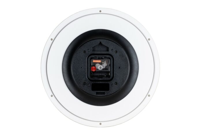 Plastic wall clock, case top with hour marking printing, sprayed white dial plate, Laser cut veneered MDF dial plate reversed numerals, Flat glass
